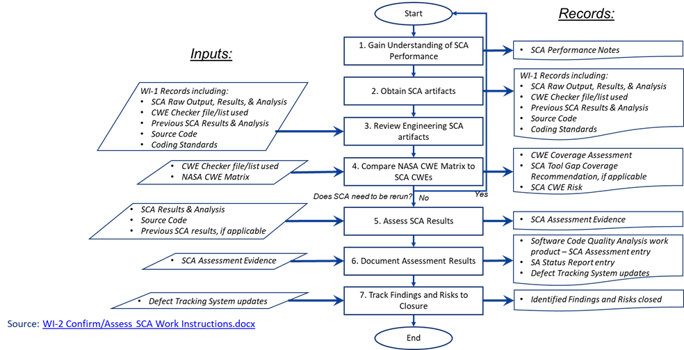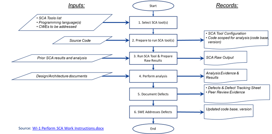 For more information on performing an SCA and to see an example, refer to Work Instruction number one on the NASA Engineering Network’s (NEN’s) Software Security 443 community site under the standards and best practices page.