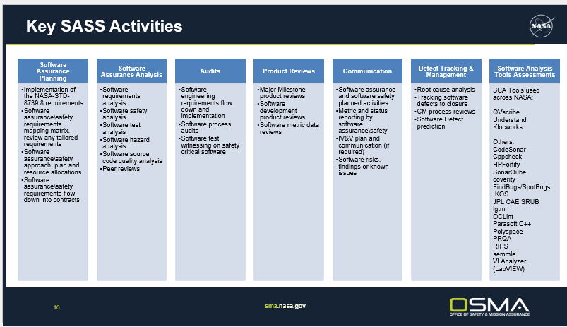 - Purpose: Ensures software security, particularly in response to NASA-STD-8739.8 requirements for safety-critical systems.
