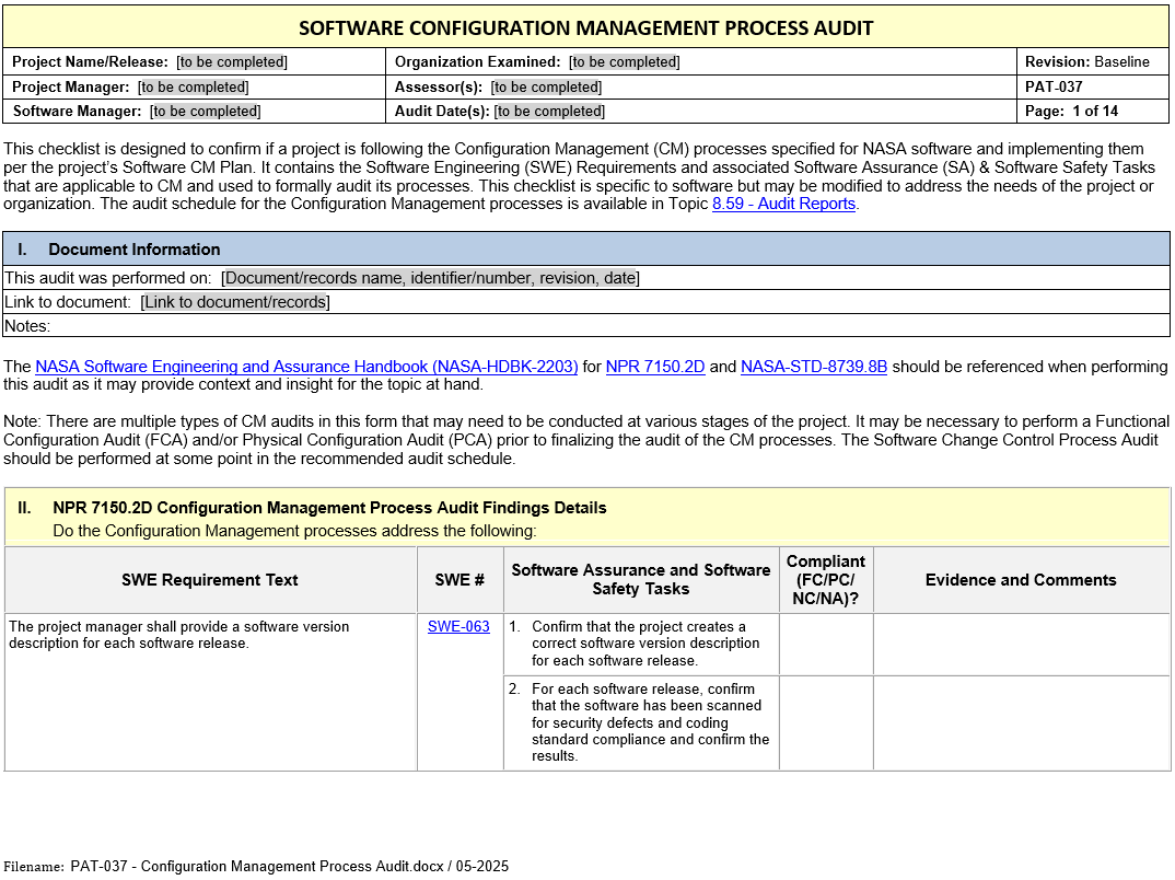 - Completed checklists tailored for FCA and PCA (e.g., PAT-037 - Configuration Management Process Audit templates) that provide a systematic review of: