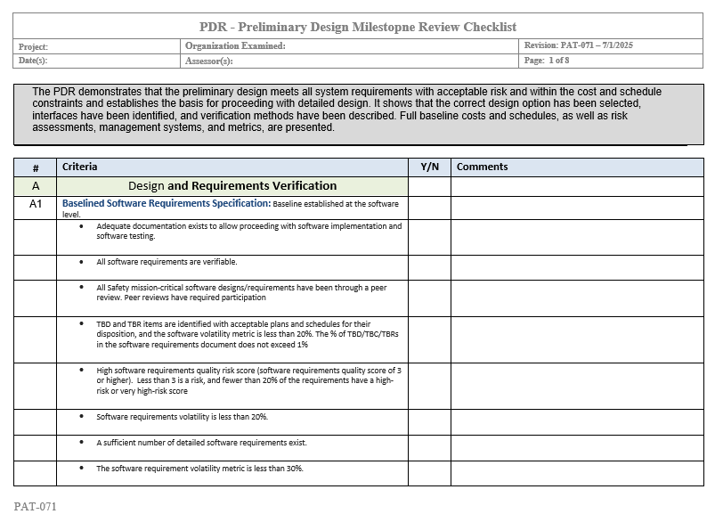 | Microsoft Word Document PAT-071 - PDR - Preliminary Design Milestone Review Checklist.docx | 49 kB | Haigh, Fred | Jul 25, 2025 13:39 |