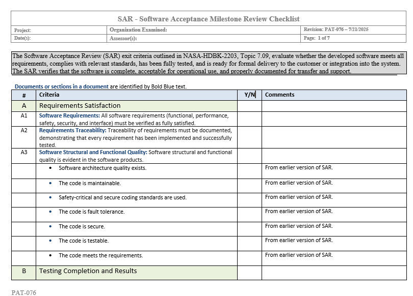 | Microsoft Word Document PAT-076 - SAR - Software Acceptance Milestone Review Checklist.docx | 50 kB | Haigh, Fred | Jul 25, 2025 13:43 |