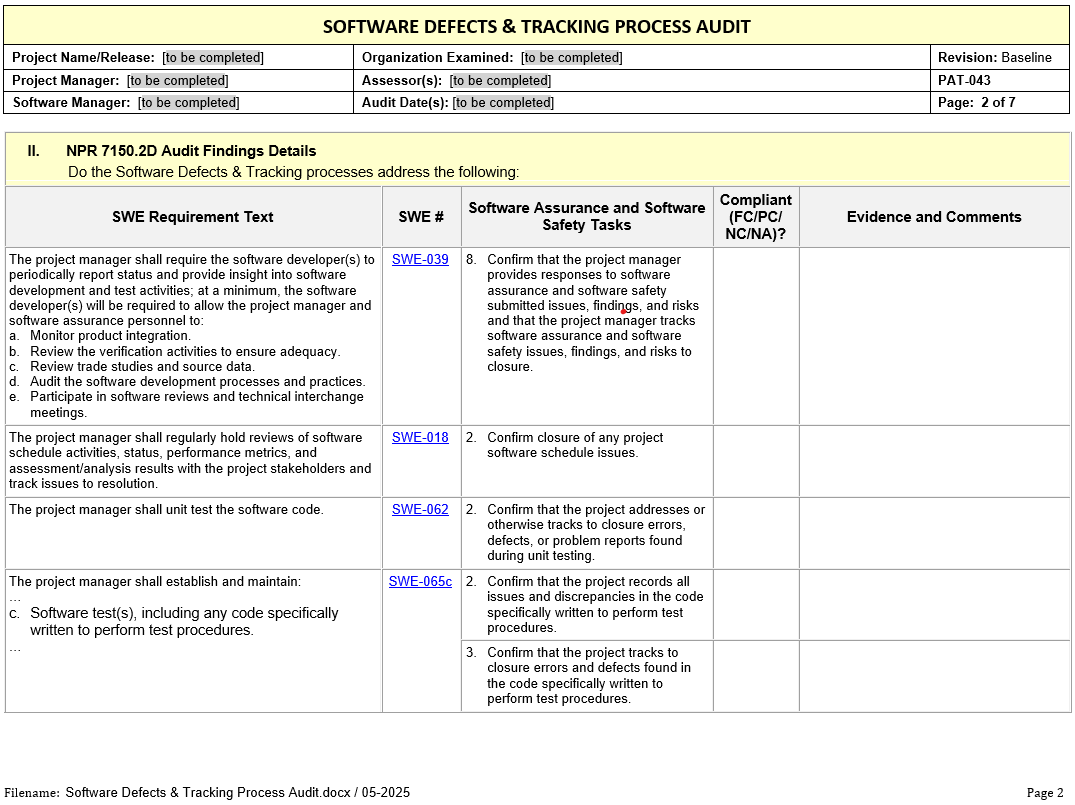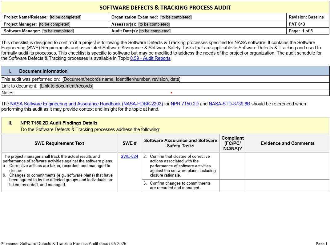 | Microsoft Word Document PAT-043 - Software Defects & Tracking Process Audit.docx | 44 kB | CATHRYN SIMPSON | May 27, 2025 20:34 |