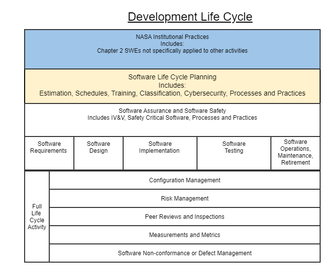 2. DefinitionsIn the context of this view of the SWEHB, some definitions are in order. These are ideas for helping partition the information so it can be organized in a way to make finding things easier. 2.1 ActivityGeneral name for a set of processes, performed by one or more groups of stakeholders in the development life cycle of a software product. Activity names may align with project phases in some cases depending on the development process or life cycle chosen for the project. Some activities are performed in a sequence. Others may be started and continue while others start up later and run in parallel with other activities. An example of this is coding and testing. These activities may appear to run together while different portions or releases of the code are being developed. An activity is composed of: - SWEs - requirements that are satisfied during the conducting of the activity, and