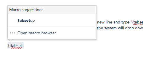The easiest way to add the macro is to start on a new line and type "{tabsetup". The curly bracket tells the system that you are inserting a macro. Part way through typing the macro name the system will drop down a menu letting you select "tabsetup" as the macro to be inserted.