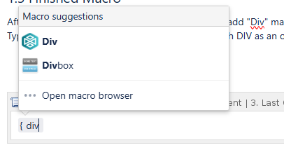 After you put in the titles in place, you will need to add "Div" macros. These are containers for content. Each is added like the tabsetup. Type "{DIV" and you will see a dropdown macro with DIV as an option. Click on it and the macro will be added to the page.